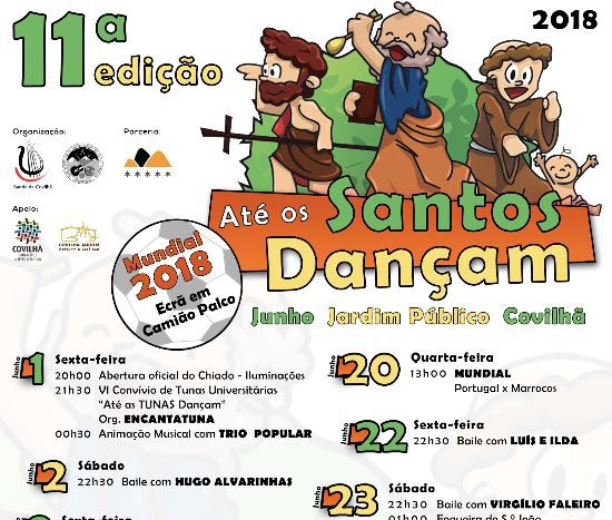 Pelo 11º ano consecutivo o Jardim Público da Covilhã volta a ser palco das festividades tradicionais do mês de Junho. O projeto “Até os Santos Dançam” acontece todas as sextas e sábados do mês de Junho com uma particularidade muito própria, a recriação do antigos chiados, a sardinha assada, os manjericos, as fogueiras, os jogos tradicionais e os bailaricos à moda antiga.