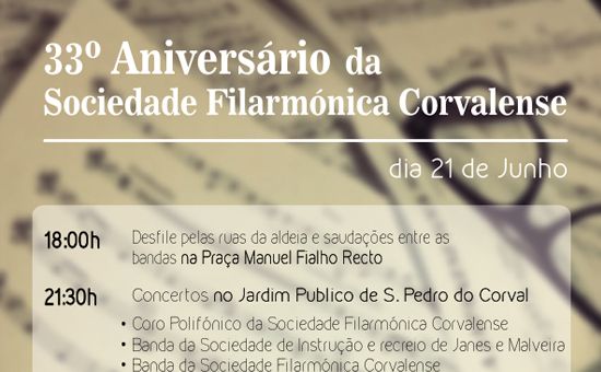 A Banda da Sociedade Filarmónica Corvalense comemora o seu 33º Aniversário no próximo dia 21 de Junho e conta com o seguinte programa: