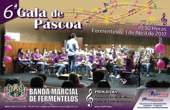 Por iniciativa dos Pais dos alunos da Escola de Música, e com o apoio da Direcção da Banda Marcial de Fermentelos, realizar-se-á a 6ª Gala de Páscoa da Escola de Música, um jantar de angariação de fundos que terá lugar no próximo dia 1 de Abril a partir das 19.30h, na sede da colectividade.