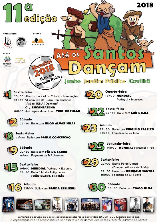 Pelo 11º ano consecutivo o Jardim Público da Covilhã volta a ser palco das festividades tradicionais do mês de Junho. O projeto “Até os Santos Dançam” acontece todas as sextas e sábados do mês de Junho com uma particularidade muito própria, a recriação do antigos chiados, a sardinha assada, os manjericos, as fogueiras, os jogos tradicionais e os bailaricos à moda antiga.